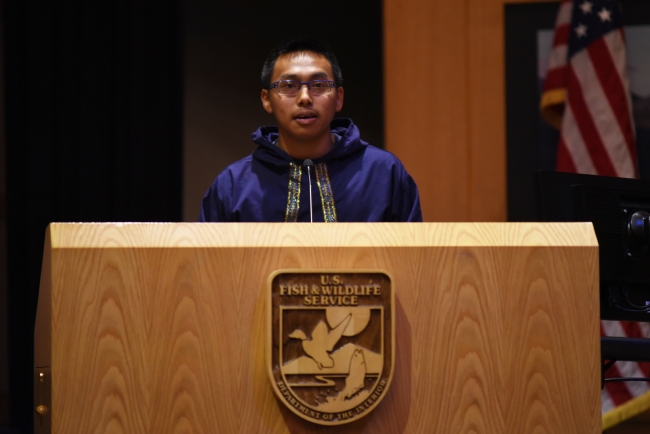 Esauk Sinnok, Arctic Youth Ambassador stands at a podium.
