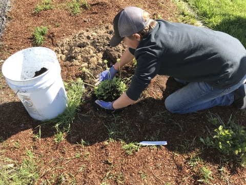 A students plants a native flower in the Etna, CA schoolyard habitat.
