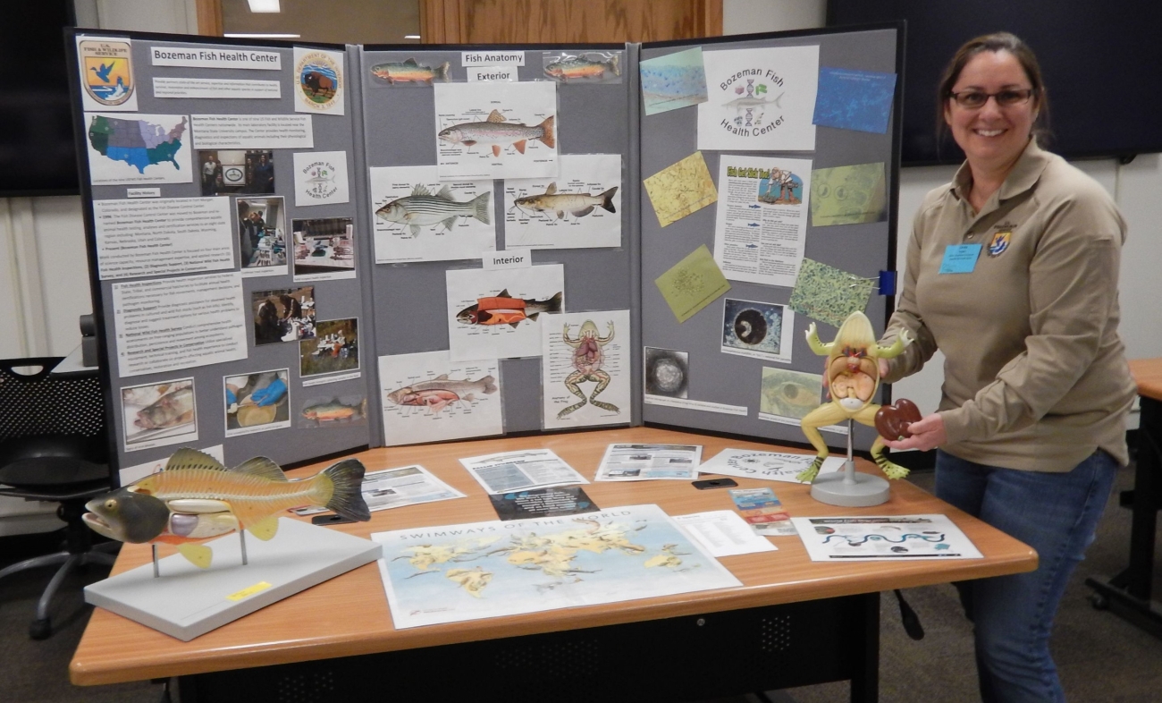 Lacey Hopper at Bozeman Fish Health Center Outreach table set up at the STEM-Expanding Horizons Outreach at Montana State University, Bozeman, MT