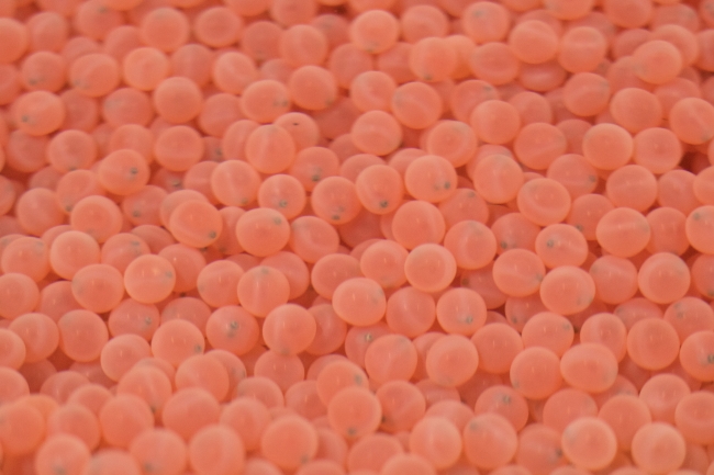 The eyes of developing Chinook salmon are visible in these Chinook salmon eggs.