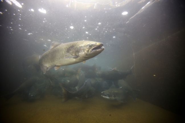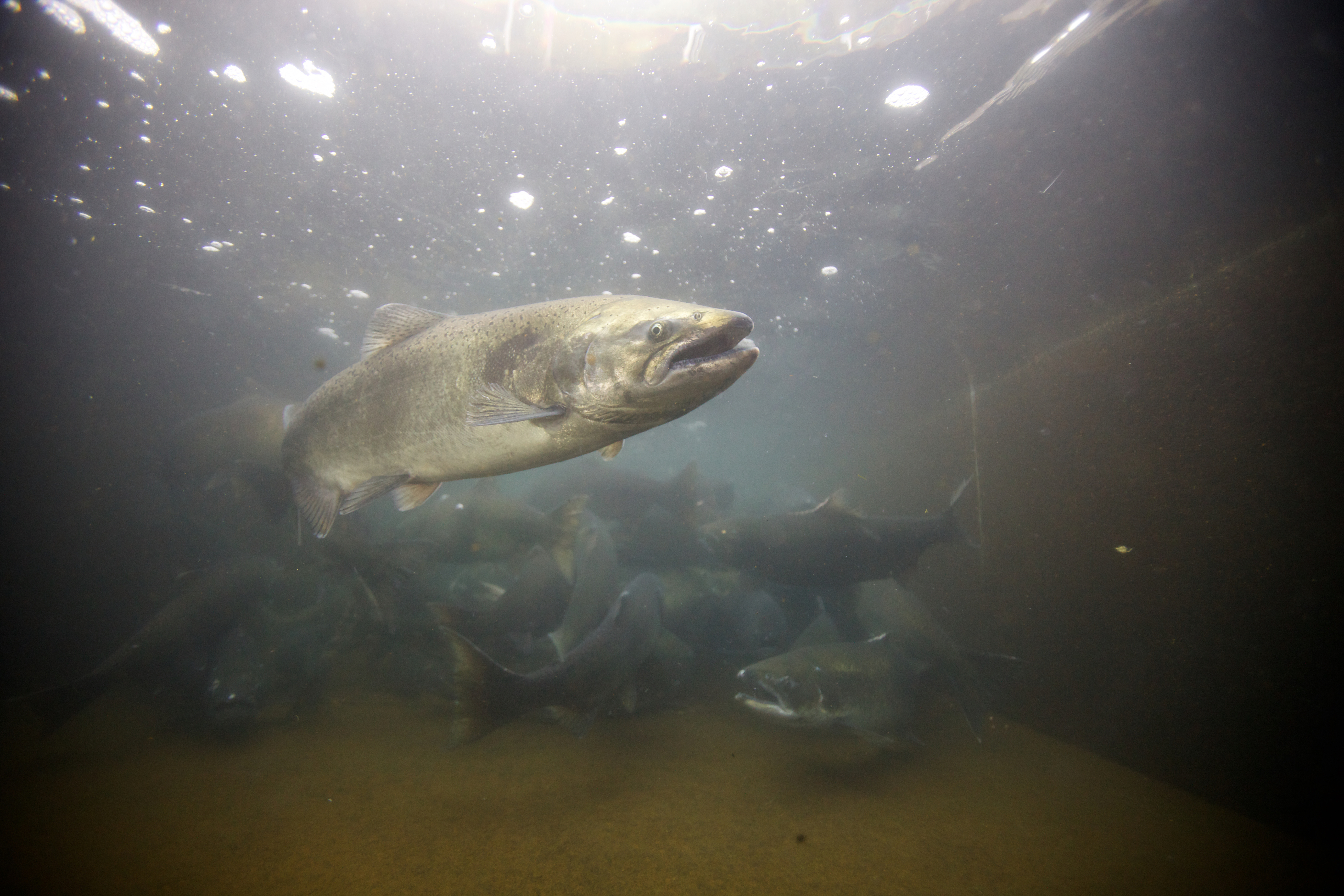 Spawning Fall Chinook Salmon and facilities underwater photography. Pacific Northwest Fisheries.