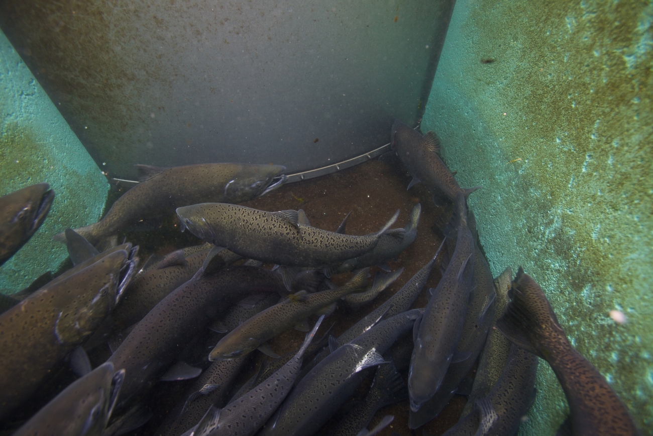 Spawning Fall Chinook Salmon and facilities underwater photography. Pacific Northwest Fisheries.