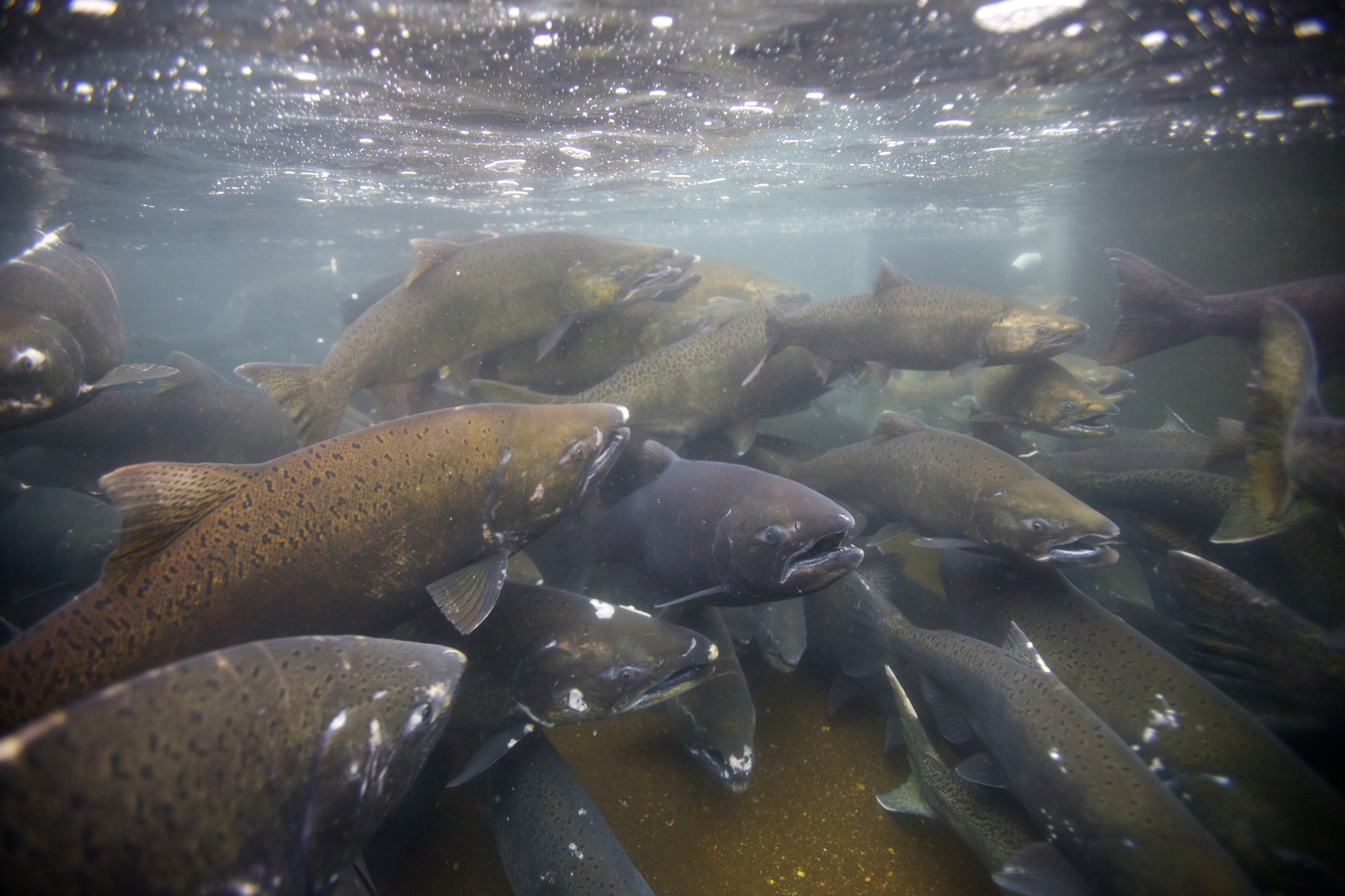 Spawning Fall Chinook Salmon and facilities underwater photography. Pacific Northwest Fisheries.