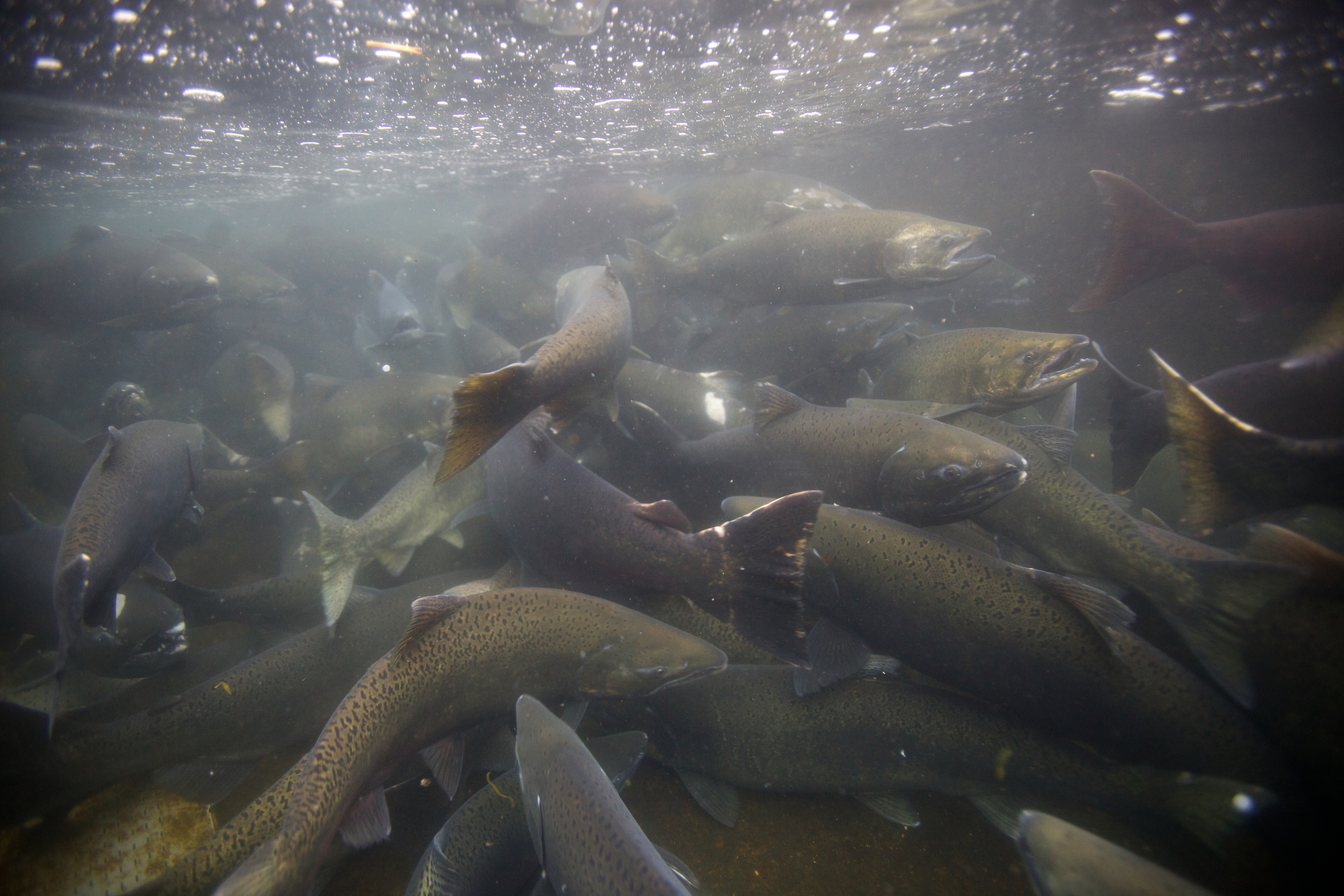 Spawning Fall Chinook Salmon and facilities underwater photography. Pacific Northwest Fisheries.