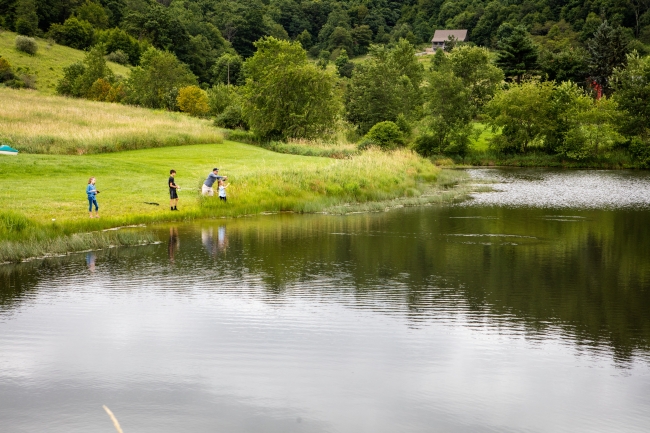 Family fishing on a pond bank in Western Maryland.