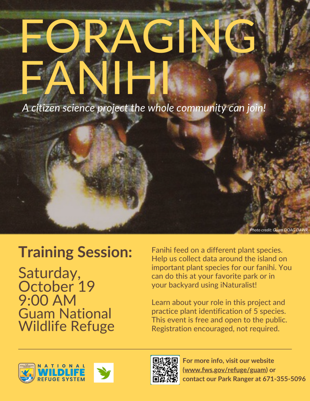 Fanihi feed on different plant species. Help us collect data around the island on important plant species for our fanihi. You can do this at your favorite park or in your backyard using iNaturalist! Learn more about your role in the project and practice plant identification of 5 species on October 19, 2024, at 9:00 a.m. at the Refuge. This event is free and open to the public. Registration encouraged, but not required. For more information, visit our website (www.fws.gov/refuge/guam) or contact our Park Ranger at 671-355-5096.