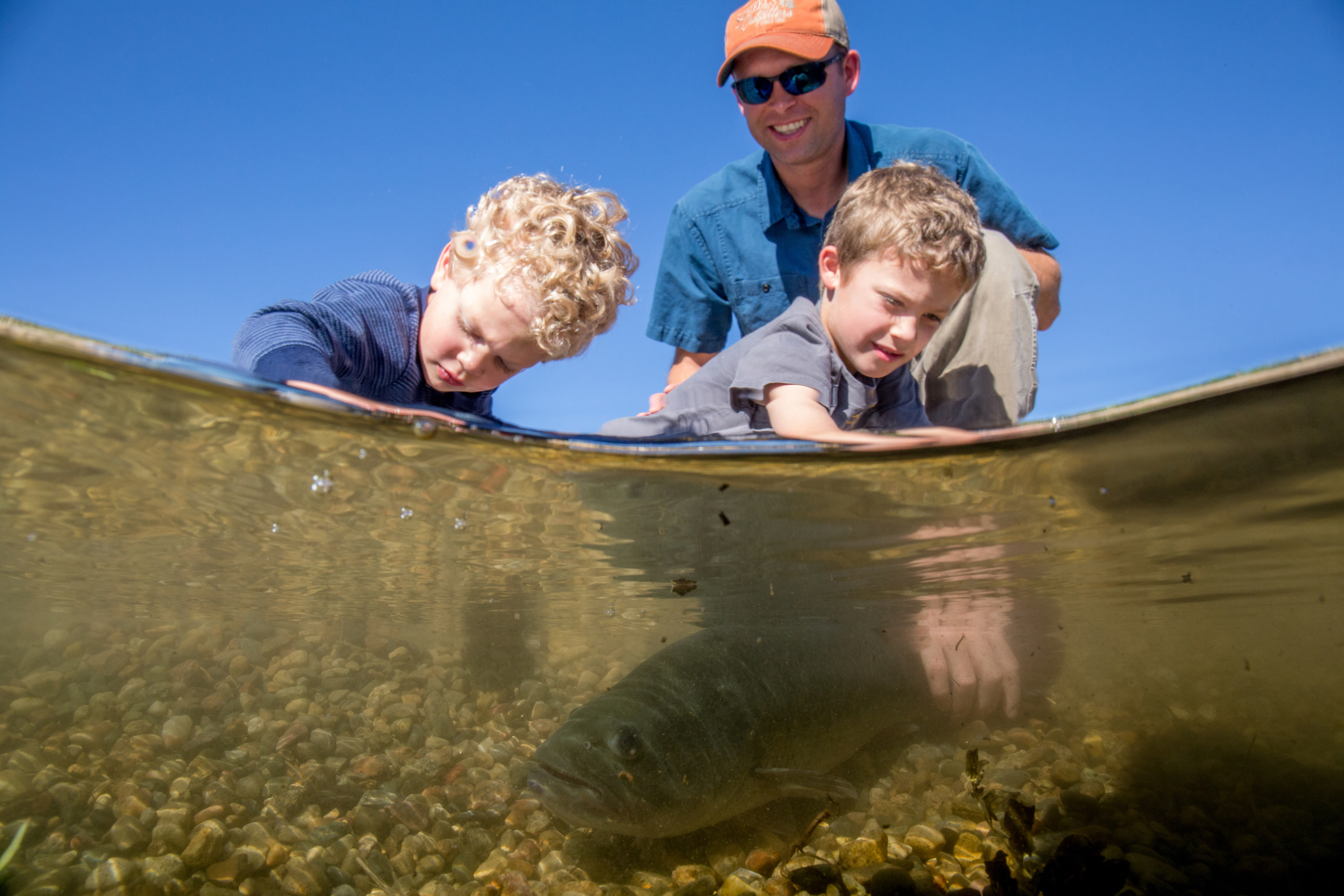 Father fishes with boys