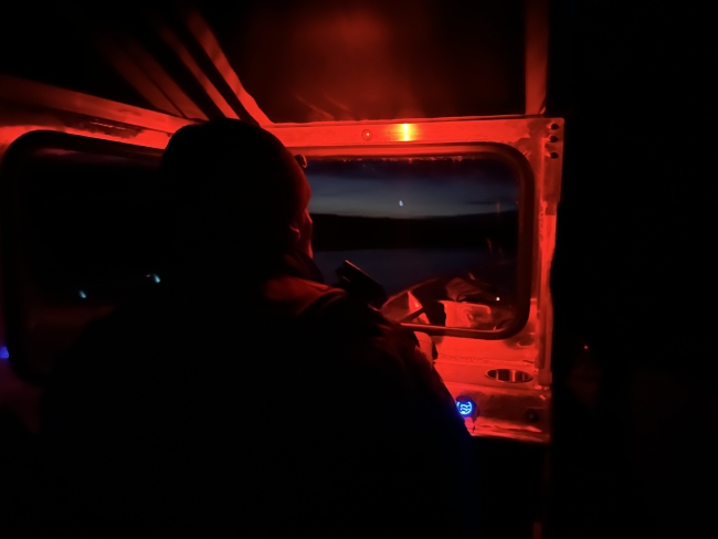 Senior Federal Wildlife Officer Matthew McDonald during a night patrol on the Kuskokwim River with SFWO Reynolds. Red light and a pair of night vision goggles are some of the tools used by FWOs on the Yukon Delta NWR to keep their operations running well into the night.