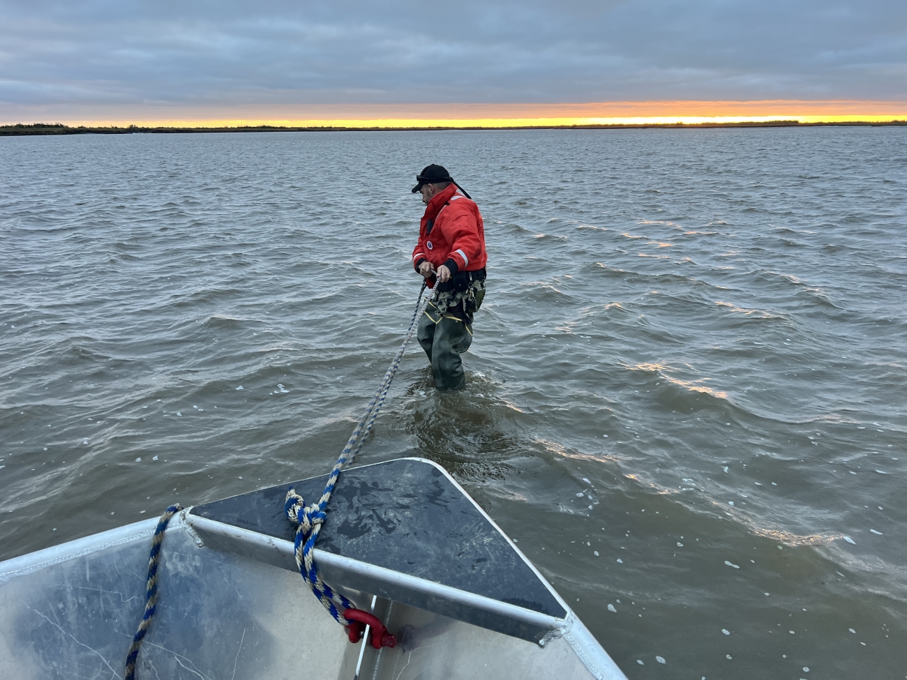 Senior Federal Wildlife Officer Matthew McDonald pulls his boat off a gravel bar near Tuntutuliak, AK.