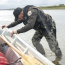 Following previous GPS tracks are not fool proof. Dynamic waters throughout the year always give the opportunity to run aground. Senior Federal Wildlife Officer Matthew McDonald experiences this as he pushes his patrol boat off a gravel bar in the middle of the Kuskokwim River, AK.