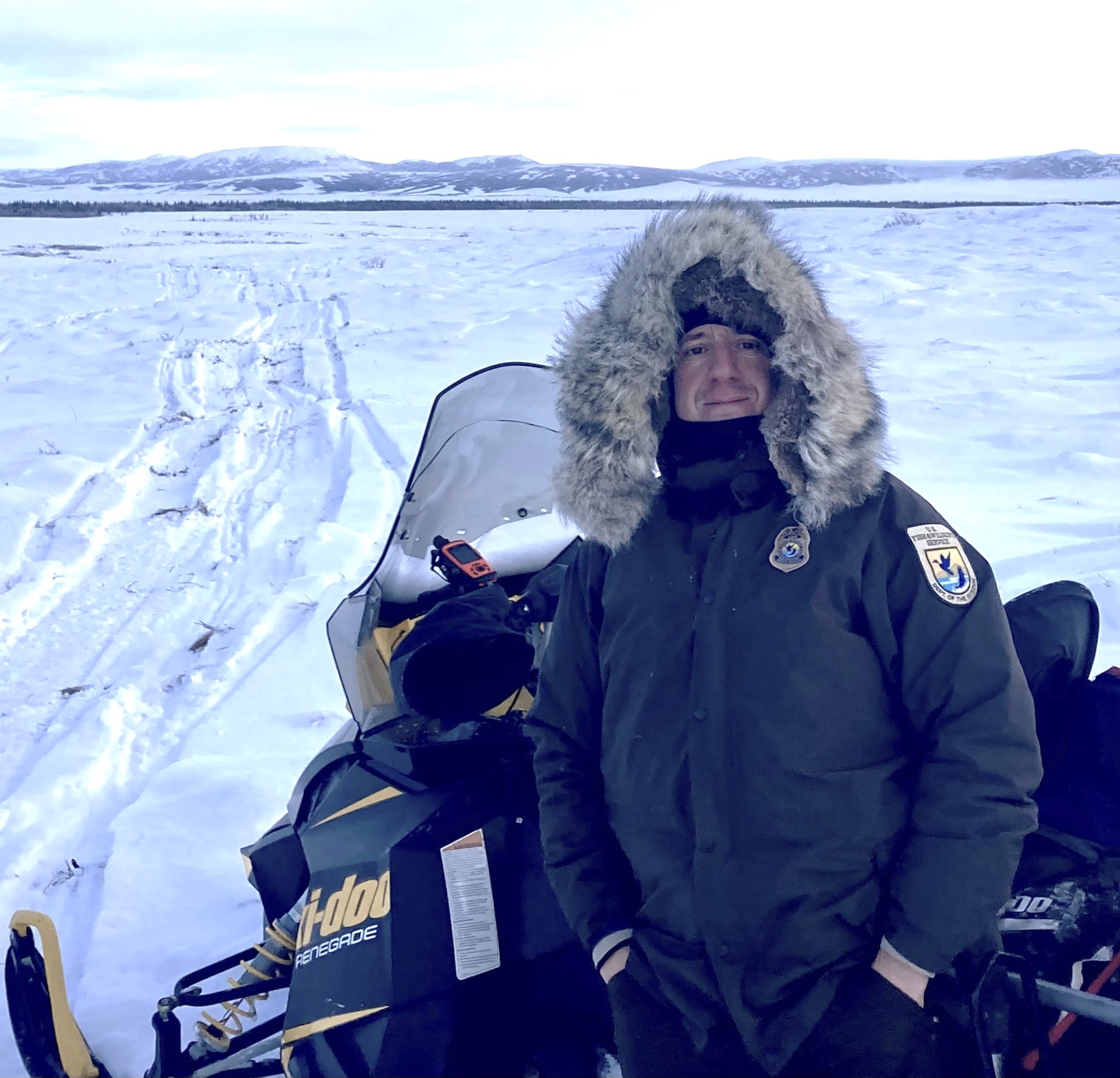 Federal Wildlife Officer Scott Pariseau on a snowmobile patrol outside Bethel, Alaska, while assigned to the Mulchatna Caribou Herd Enforcement Detail.