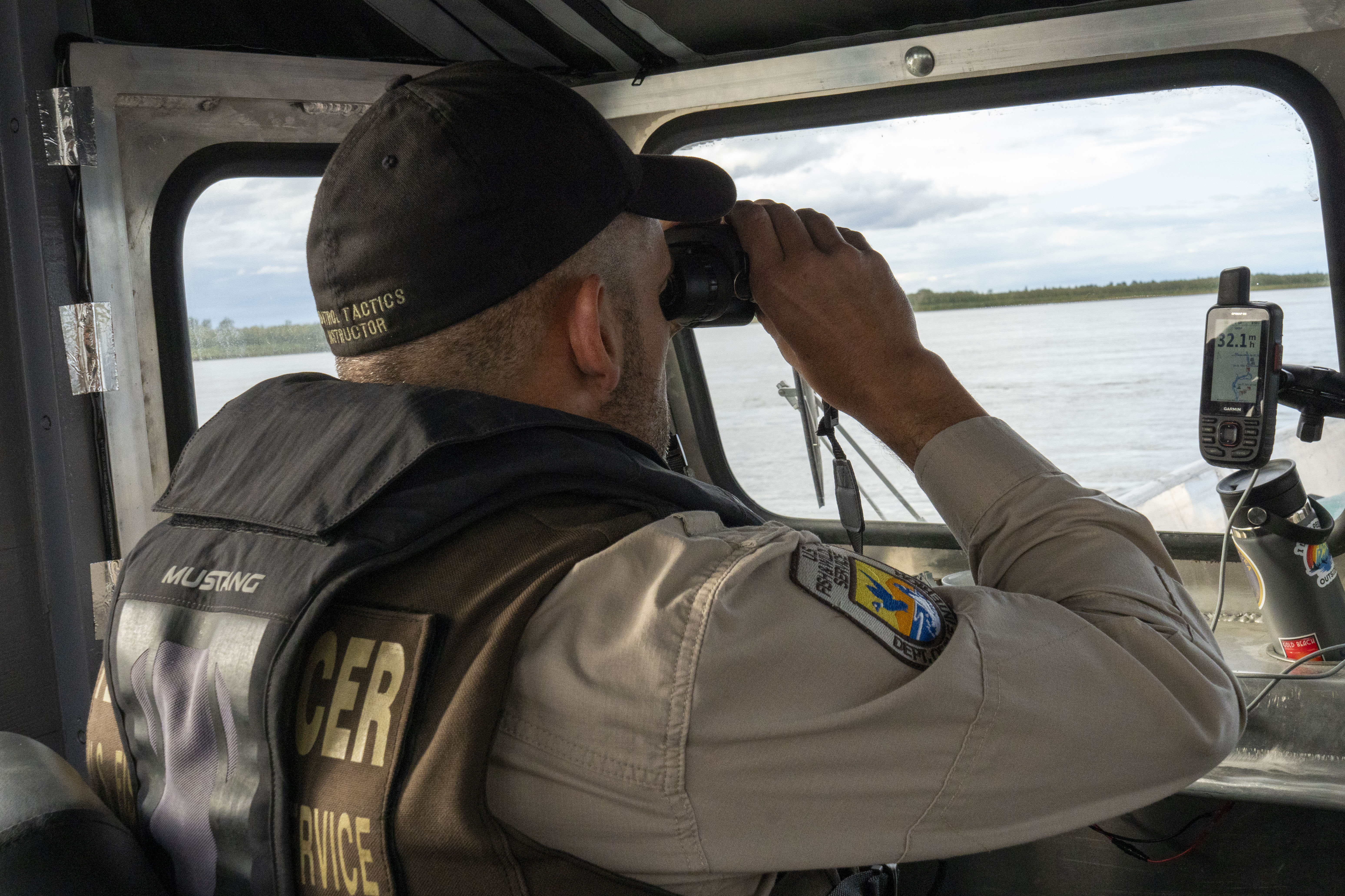 Some quality binoculars are an invaluable tool for Senior Federal Wildlife Officer during a patrol of the Kuskokwim River, Alaska.