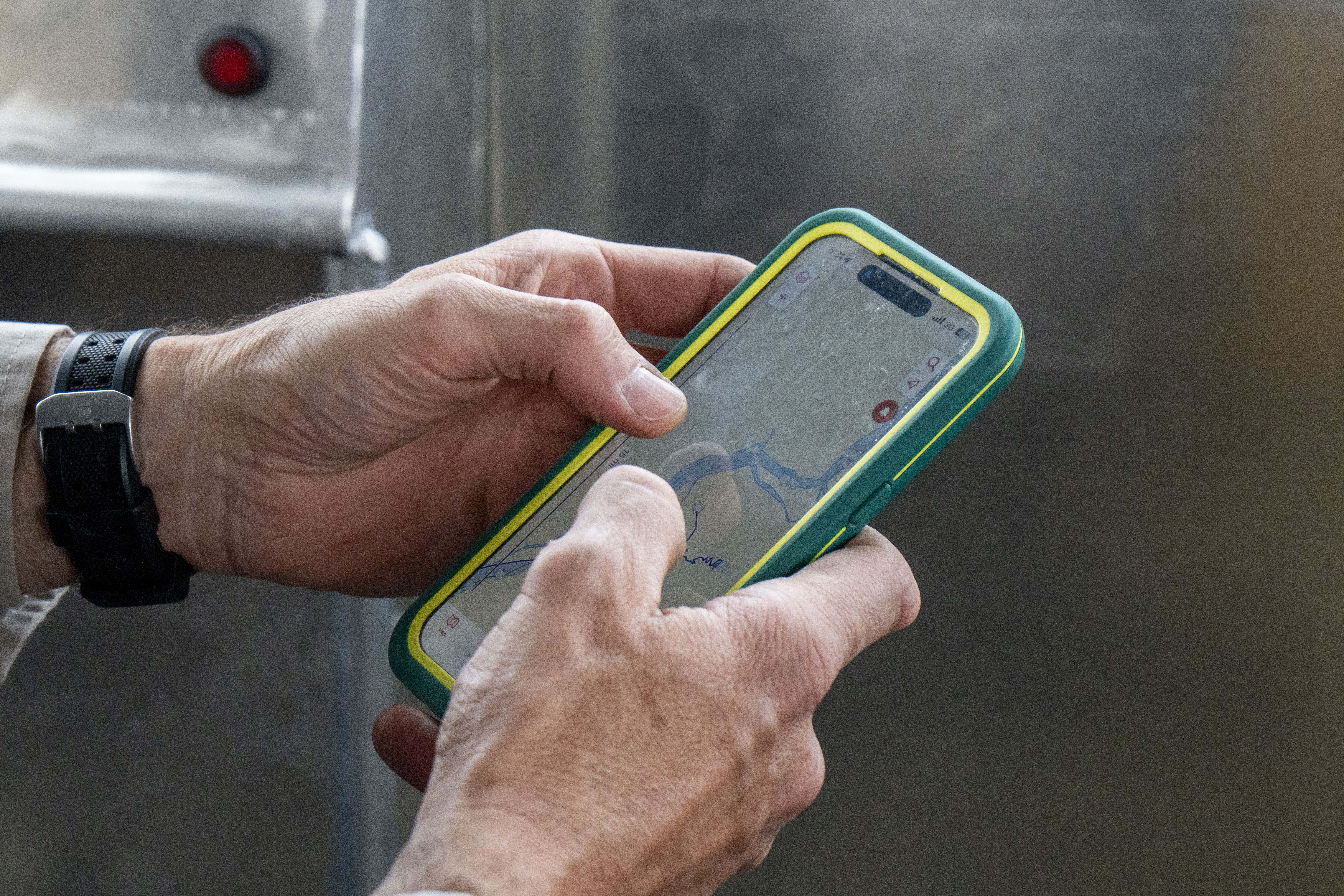 Federal Wildlife Officer uses a GPS tethered to his phone to find his location on the Kuskokwim River, Alaska.