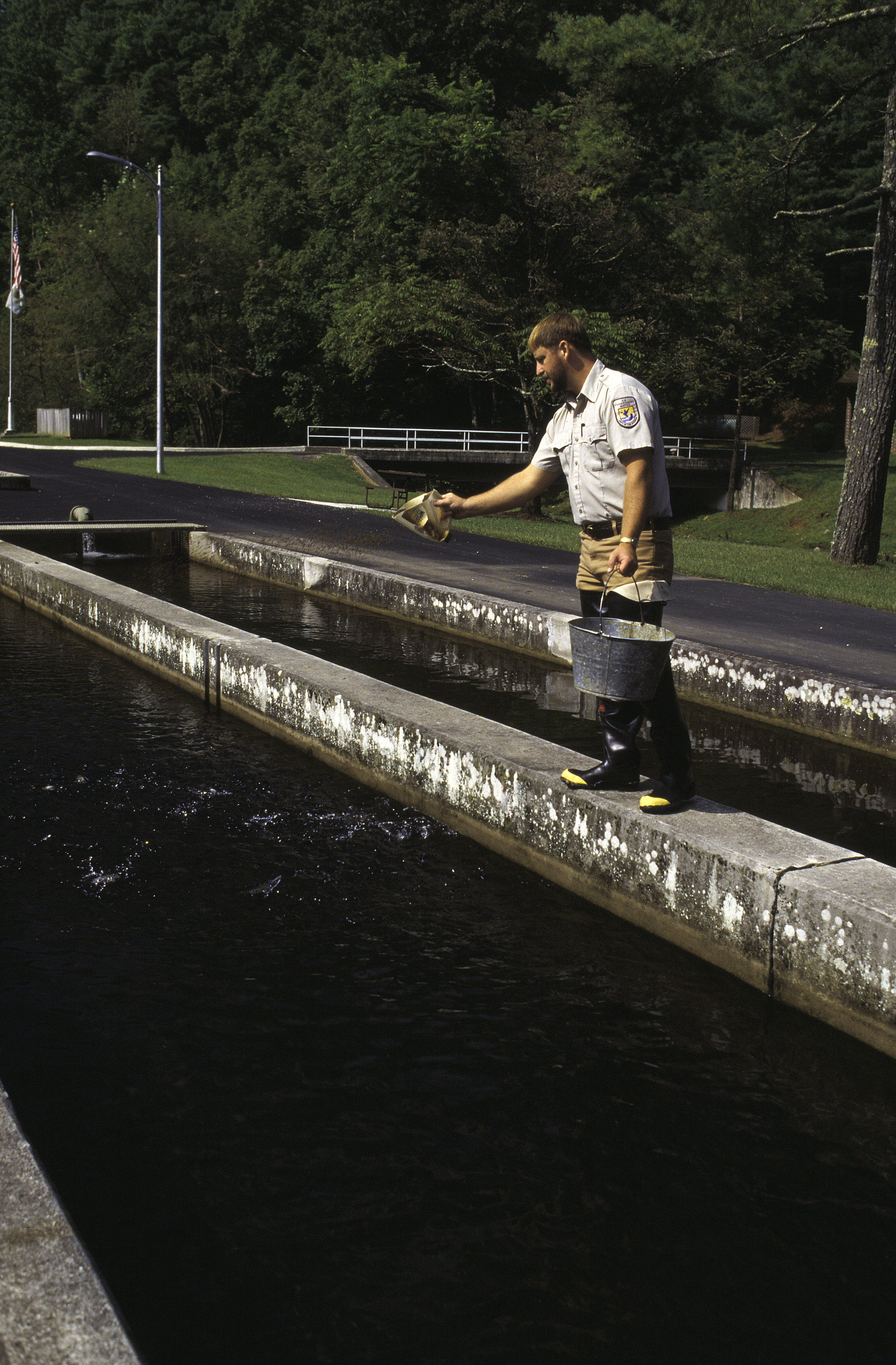 Feeding fish in a fish hatchery. A fisheries biologist distributes food to fish in the hatchery raceways.