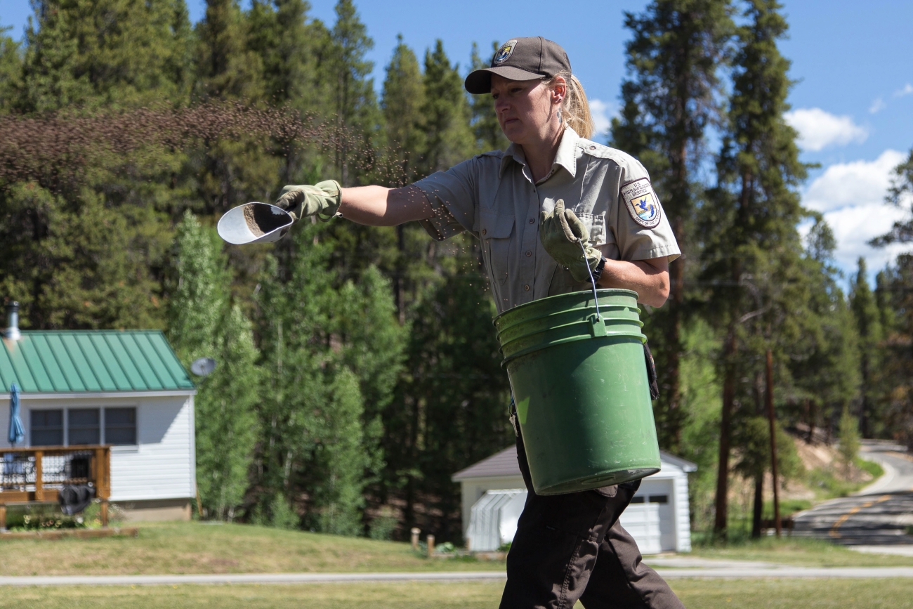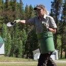Service employee is feeding hatchery fish at Leadville National Fish Hatchery.