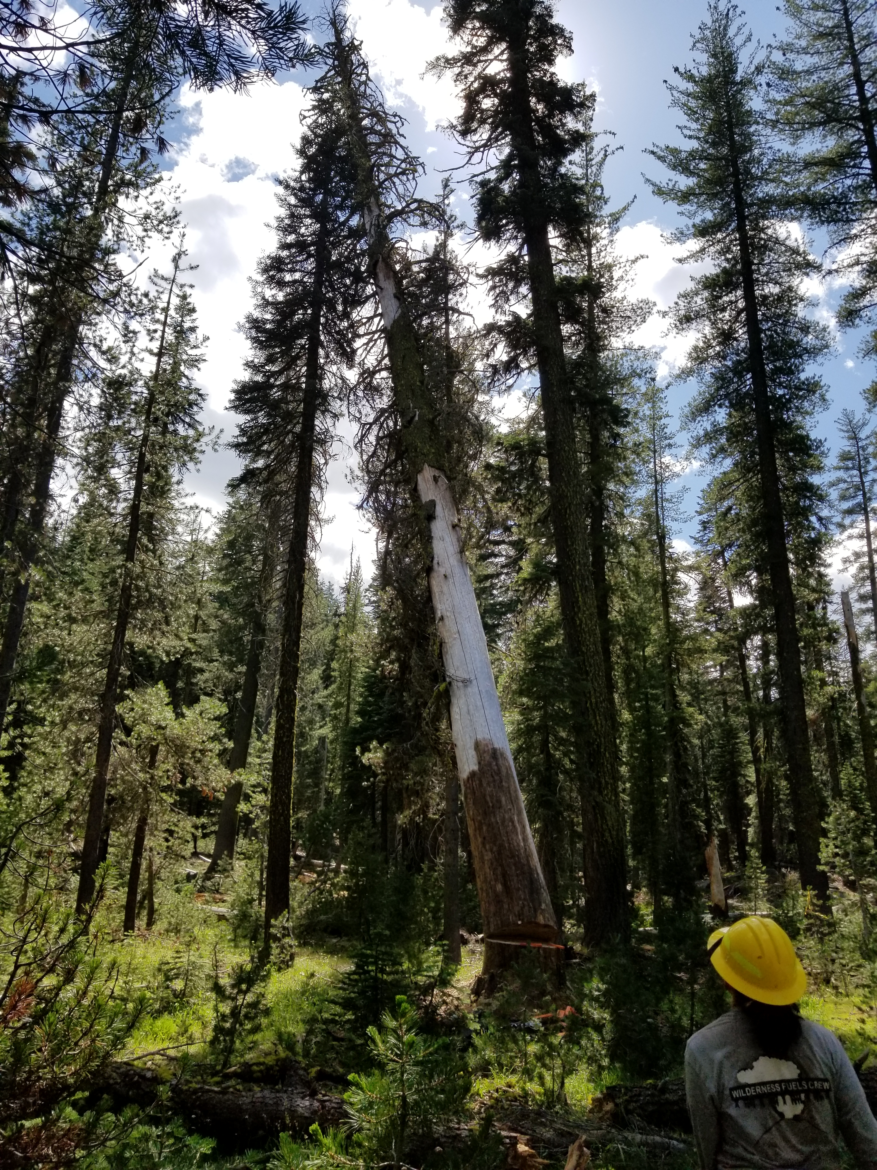 A cross-cut saw crew member observes a large tree falling after being cut.