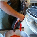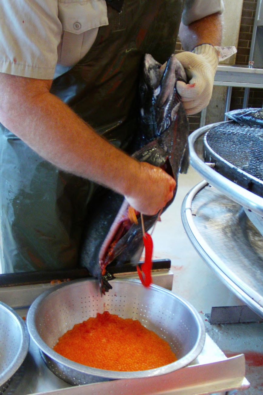 The eggs are removed from the females and placed in a container. Each female Chinook has between 4,000-5,000 eggs.