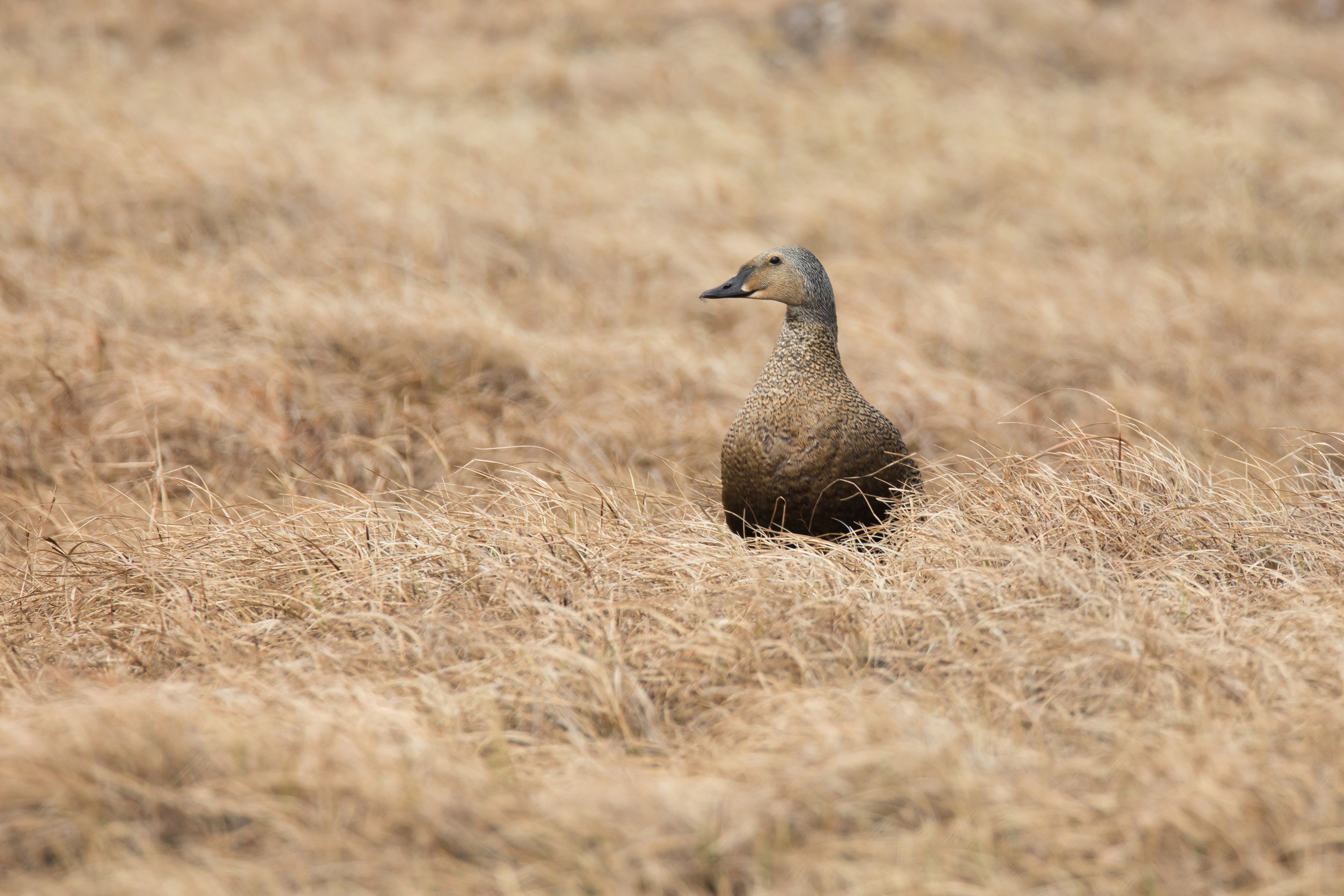 The female King Eider alone attends the nest. When an intruder is present, the female sits low on the nest with her head flattened on the ground. She sits tightly on the eggs and sometimes can be touched or picked up off of the nest.