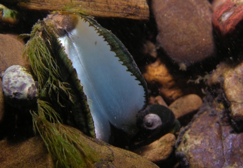 Female oyster mussel (Epioblasma capsaeformis) gaping at the substrate surface to attract a host. The iridescent mantle tissue and undulating microlure entice a fish to enter the shell where it is captured with the help of the teeth along the shell margin. Photo: Rachel Mair, USFWS.
