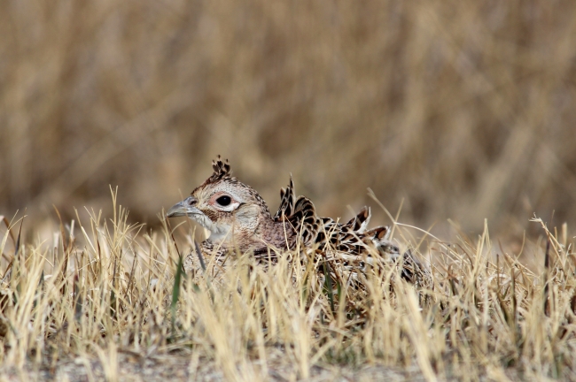 A windy hairdo. This female (hen) ring-necked pheasant sports quite a look. North Dakota is infamous for its wind.