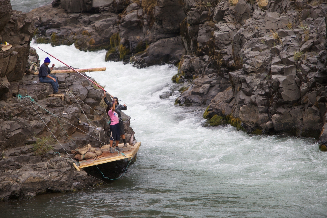 A pair of female Yakama tribal members fish in the Klickitat River for Fall Chinook salmon. Dip nets, traditional fishing, Columbia River Fishery, Hatchery Columbia River Inter-Tribal Fish Commission. Pacific Northwest Fisheries.