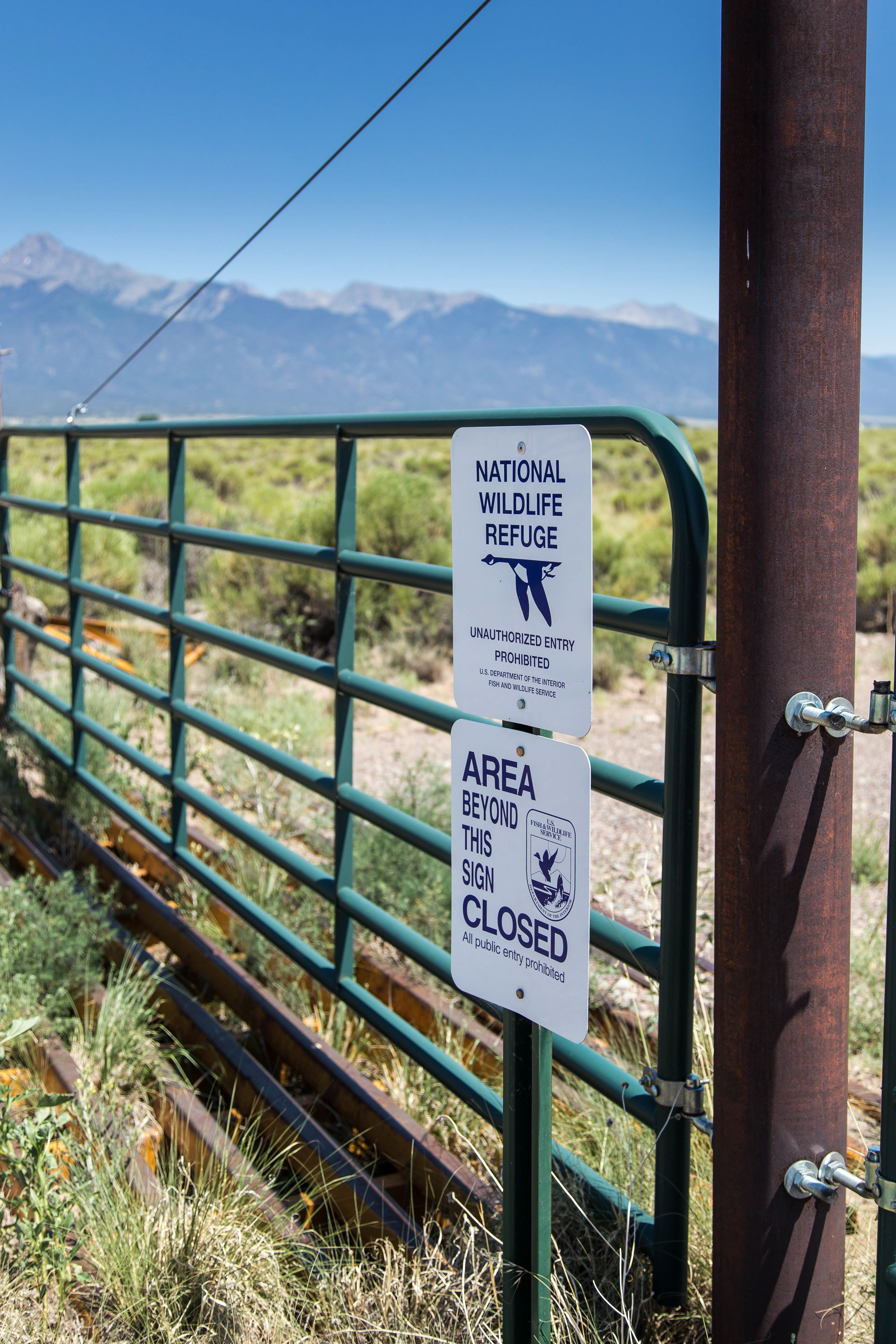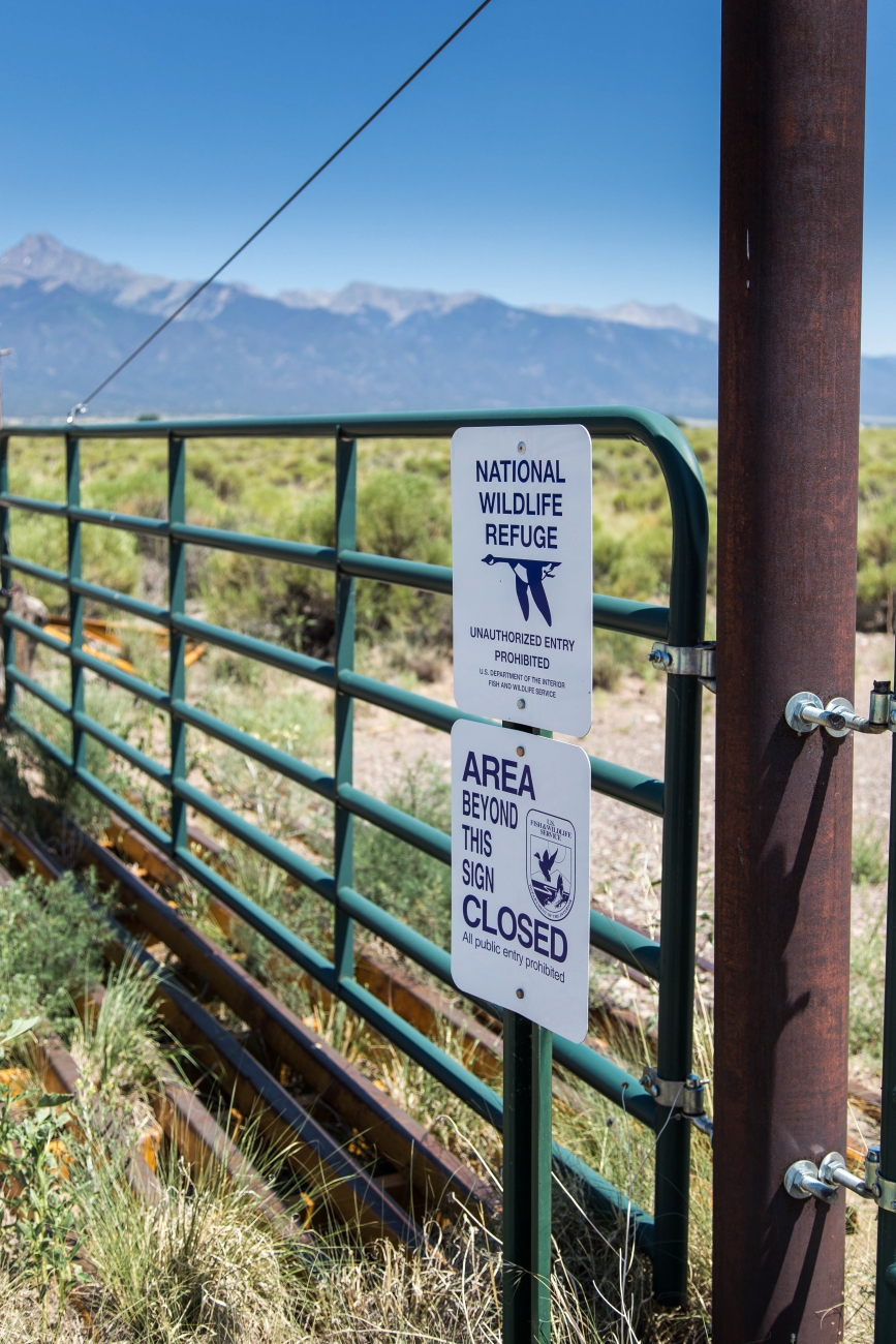 Gated area on the refuge with closed area signs and fencing. Scenic of mountains in the background.