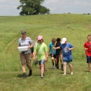 A teacher leads her small group of students on the Tintah Trail during the Summer Explorers Biology Camp and Workshop (L.C. in the background).