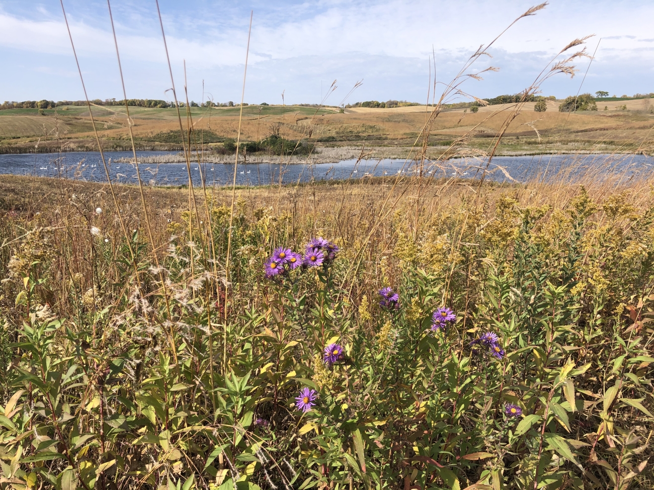 New England aster blooms in a restored prairie uphill from a wetland studded with trumpter swans on Dan Gahlon's property in Douglas County, Minnesota.