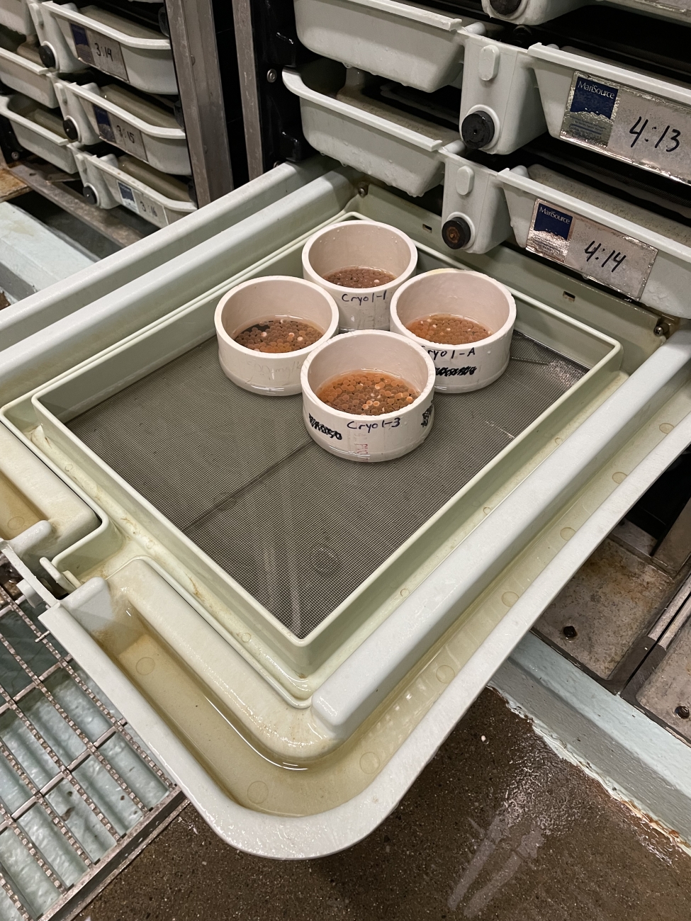 PVC cups with screen bottoms hold differently fertilized sets of Atlantic Salmon eggs. The eggs are being set in hatching racks to incubate until embryos can be counted.