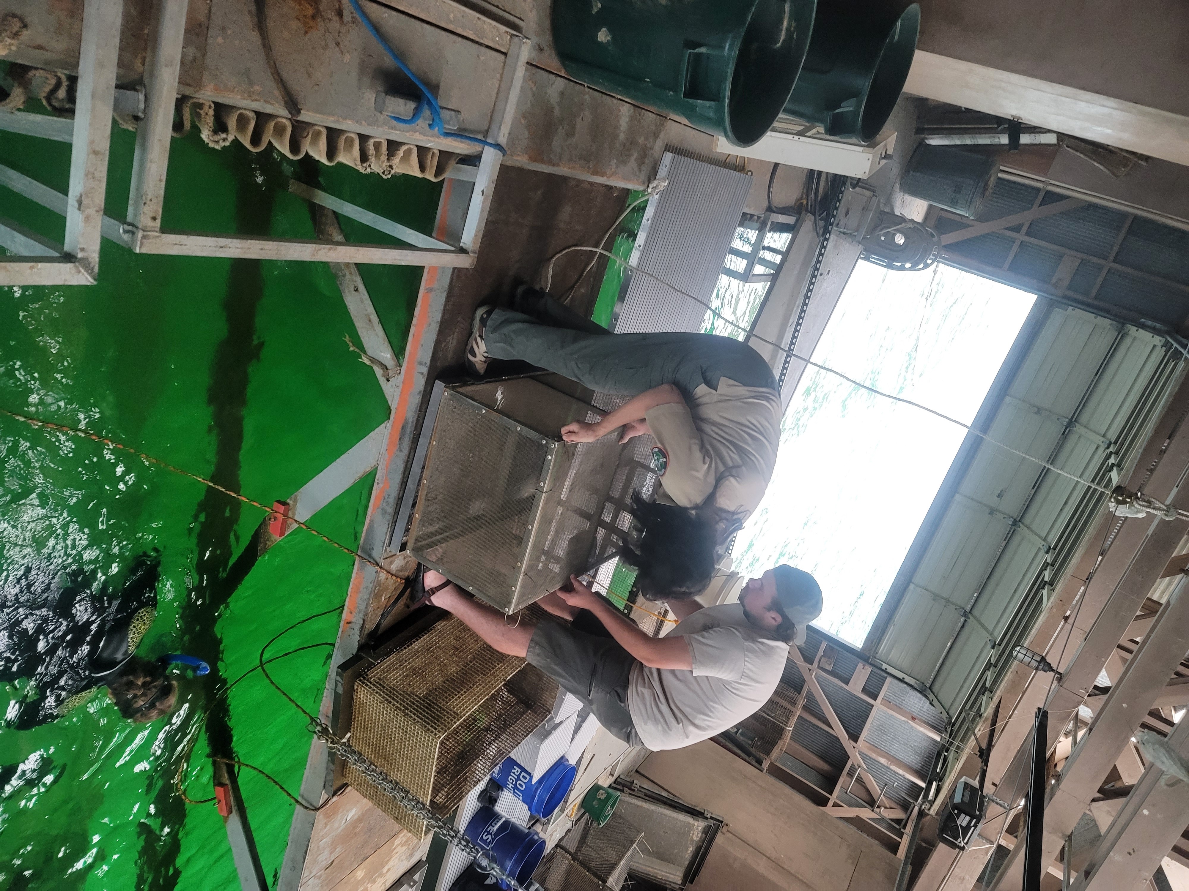 Each cage is filled according to mussel size anywhere from 200 to several thousand mussels. TWRA and USFWS staff use a small hoist or hand lift the cages slowly in and out of the water during harvest, inventory and planting.