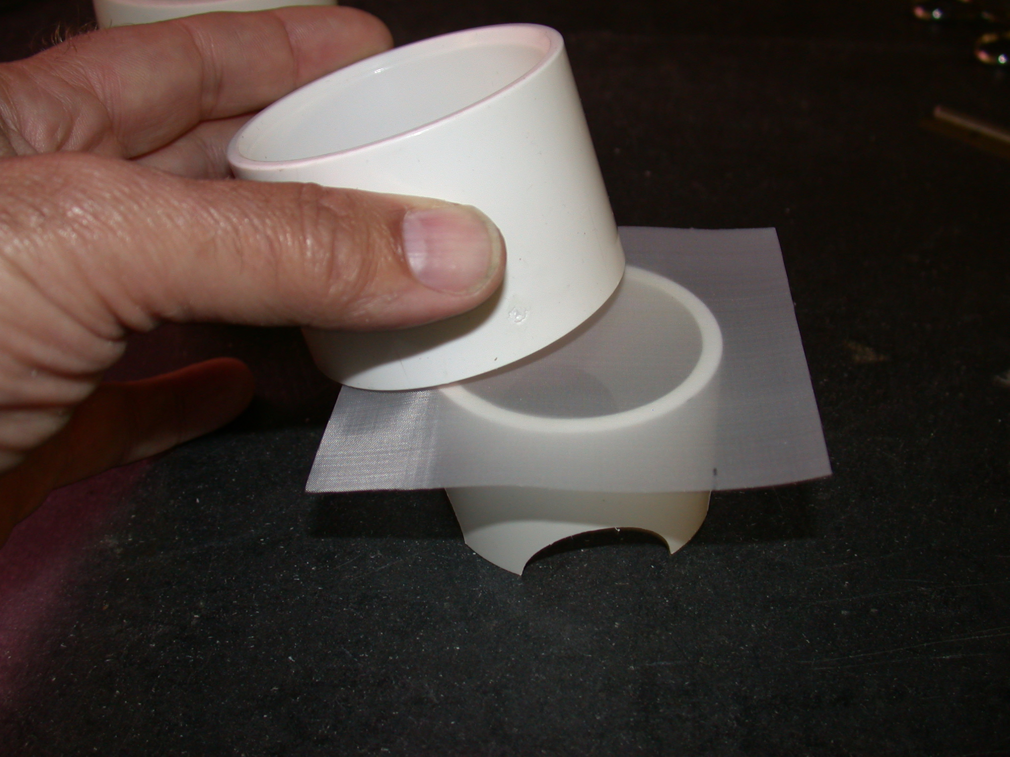 A filter cup used to collect juvenile mussels at Missouri State University. The cup is constructed of a short piece of PVC pipe with legs cut in the bottom to allow water to drain, fine mesh screening, and a PVC coupler. Photo: Chris Barnhart, Missouri State University.