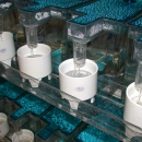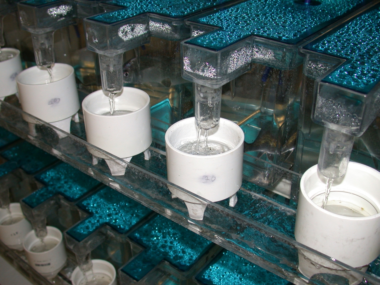 The filter cups are placed in the drain trough immediately below the outflow of the self-cleaning tanks to collect juveniles. Photo: Chris Barnhart, Missouri State University.