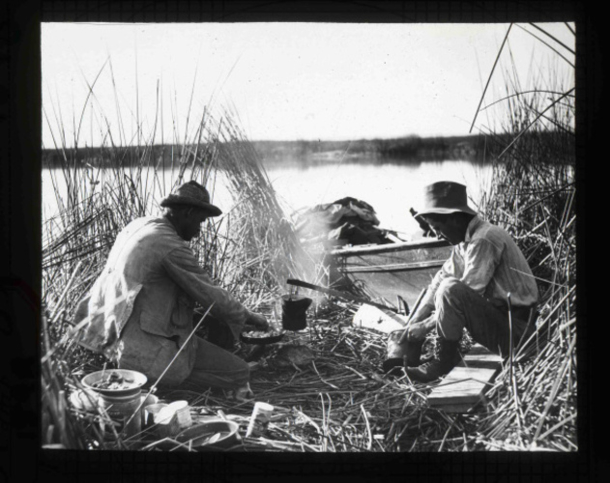 Finley and Bohlman at a camp site in Klamath Marsh during 1905 trip. William Finley on the right cleaning a pot while Herman Bohlman on the left cooks a meal. Their work together photographing the area would later help Klamath become a bird refuge in 1908.
