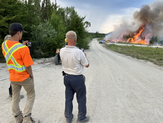 Spectators watch as fire crews complete firing operations to tie Fire 245 into Parent Lake in Quebec, Canada.