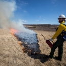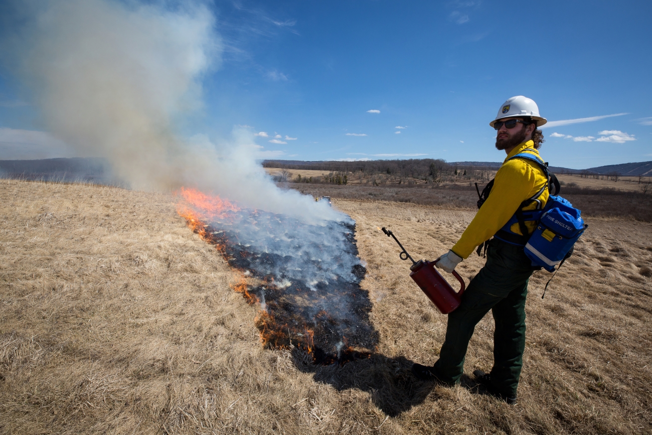 Firefighter standing guard over fire. Prescribed burn at Canaan Valley NWR.