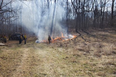 Firefighters gather around small burn area. NCTC Prescribed Burn