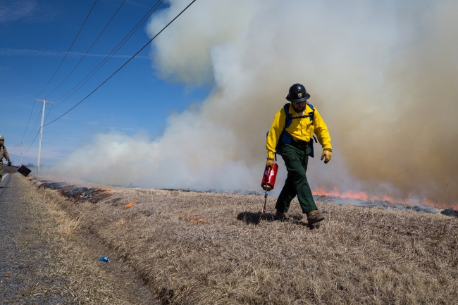 Fireman lighting fire in grassland. Prescribed burn at Canaan Valley NWR.