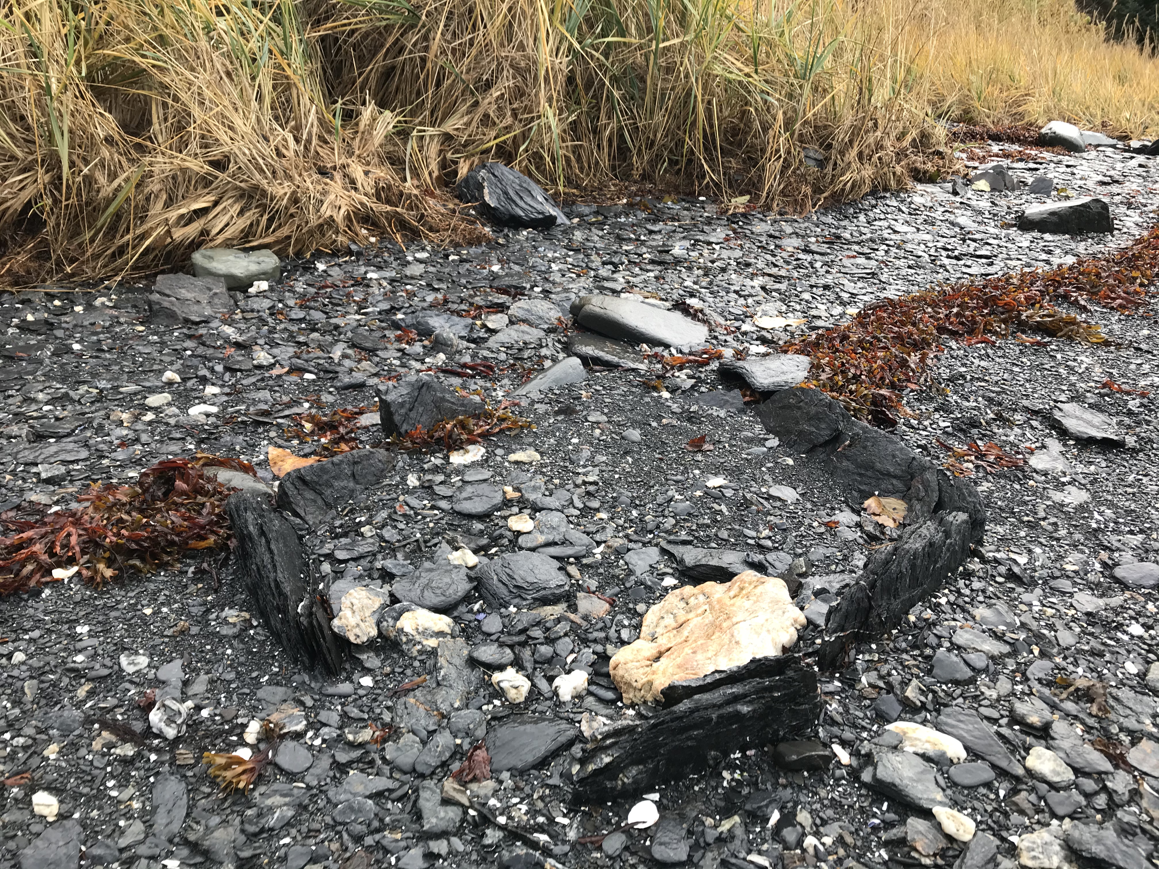 This fireplace made of slate slabs, eroding from a nearby beach, is one of the clues that Alutiiq ancestors settled the shores of Quluryaq. Alutiiq Museum photograph, AM897.