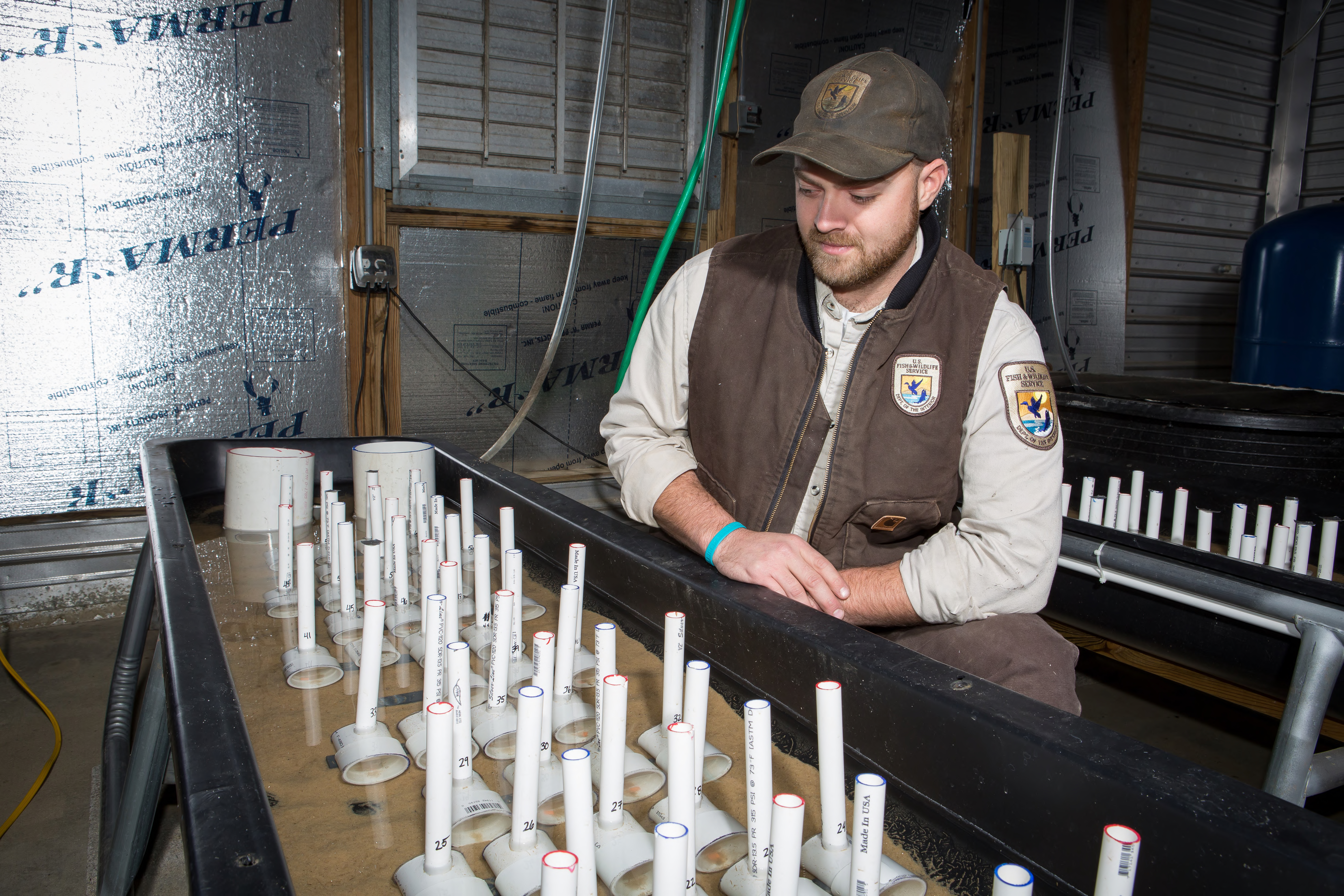 Fish and Wildlife Service biologist inspects the growth of crayfish
