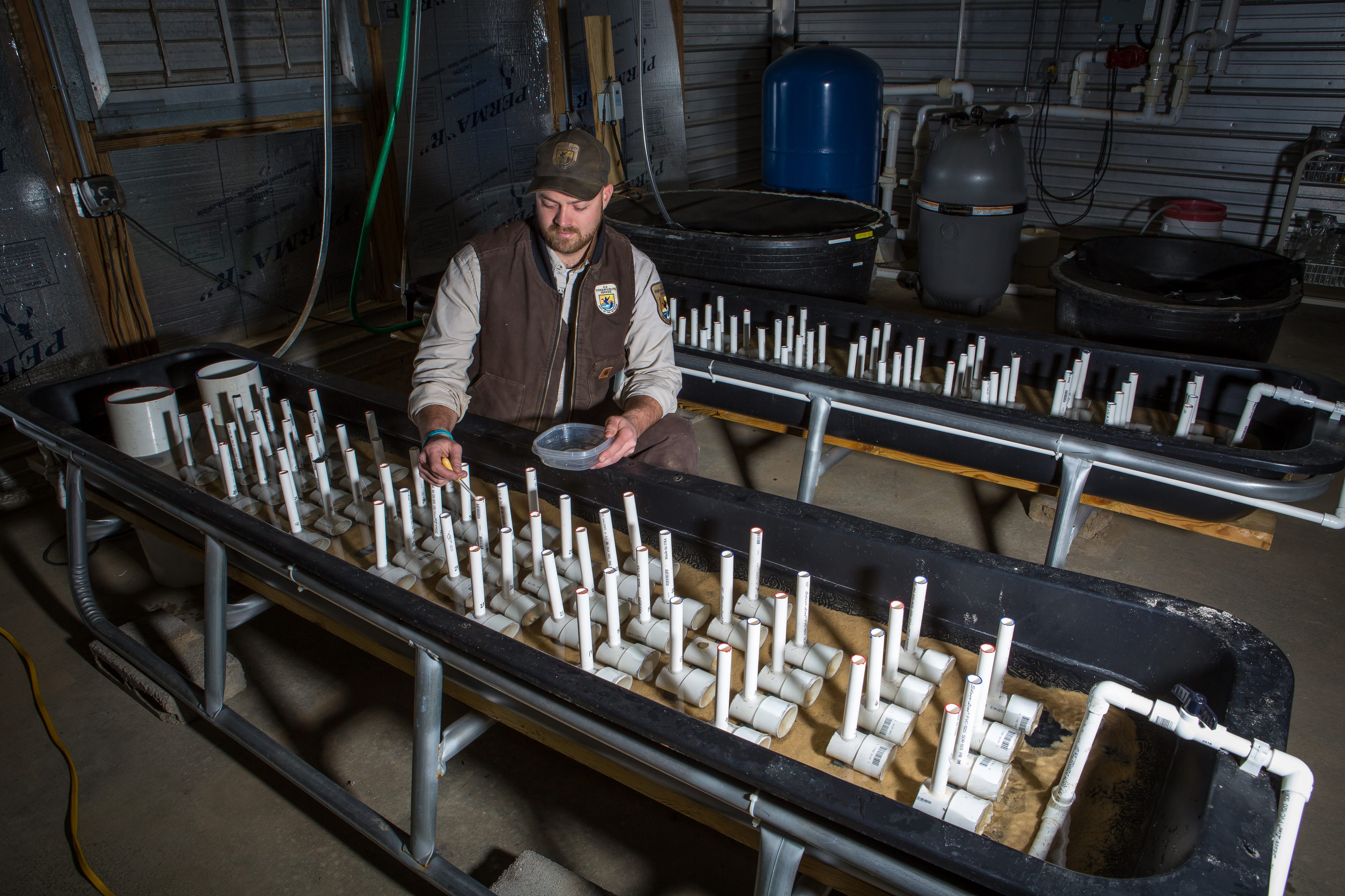 Fish and Wildlife Service biologist inspects the growth of crayfish