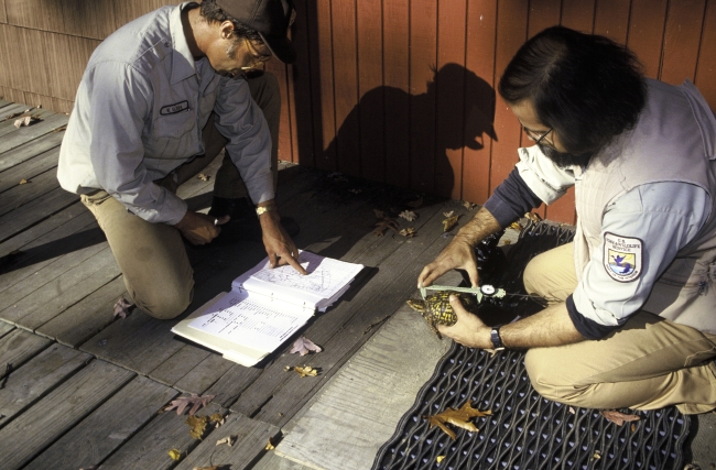 FWS BIOLOGISTS STUDY EASTERN BOX TURTLE. Service biologists study Eastern box turtles, prized for their small size and bright colors. International trade in the species to satisfy the demand for them as pets, combined with declining populations, now may