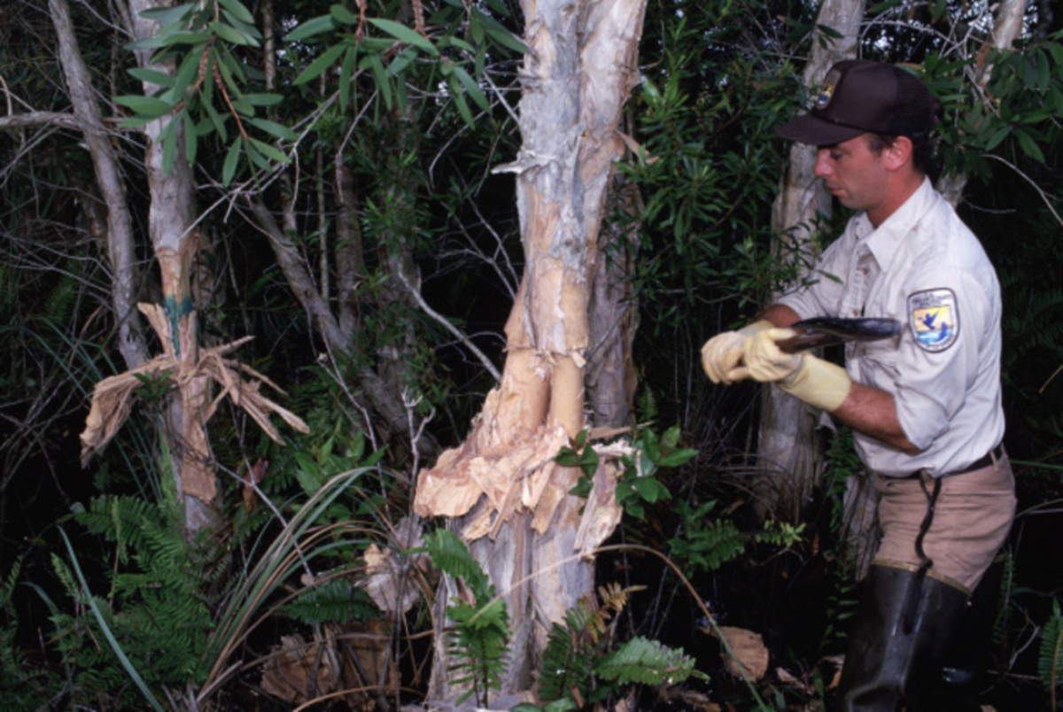 Fish and Wildlife Service employee with axe, chopping at melaleuca tree trunk in refuge invasive species eradication program.