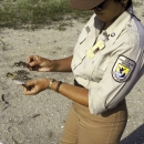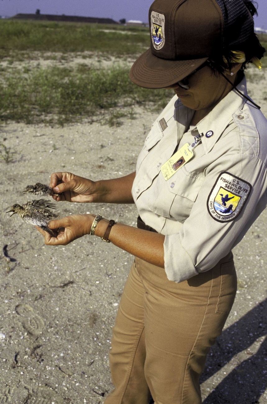 FWS biologist examines a dead California least tern at its nest on Seal Beach in California. The interior population of least tern was listed as endangered in 1985. Populations along the East and West coasts are not endangered.