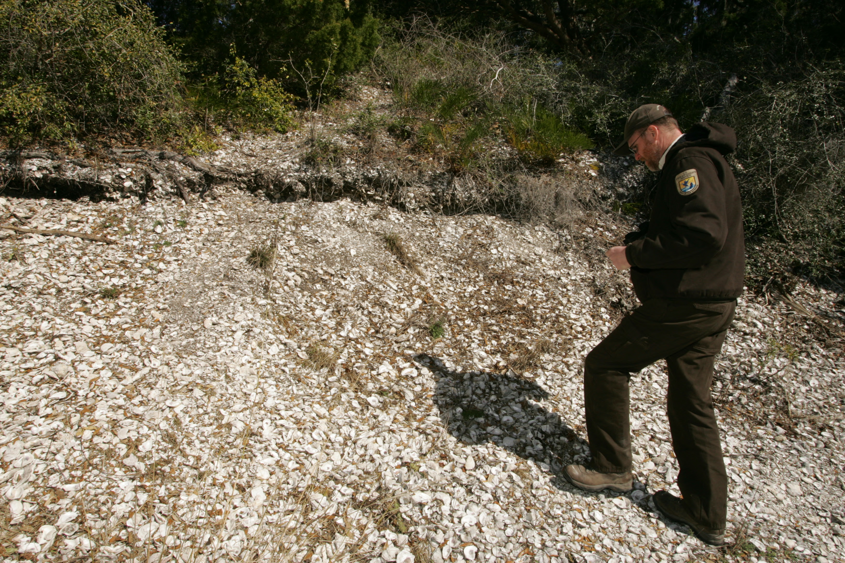 This ancient feature was initially created by Archaic cultures and completed by Woodland period cultures. Its height was reached by the discarding the shells of their food source - oysters, clams, and other mullosks. over a 6,000 time span. Once used as a source of materials for road construction (prior to Refuge ownership) the mound is now protected from all but foot traffic.
