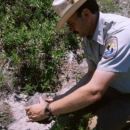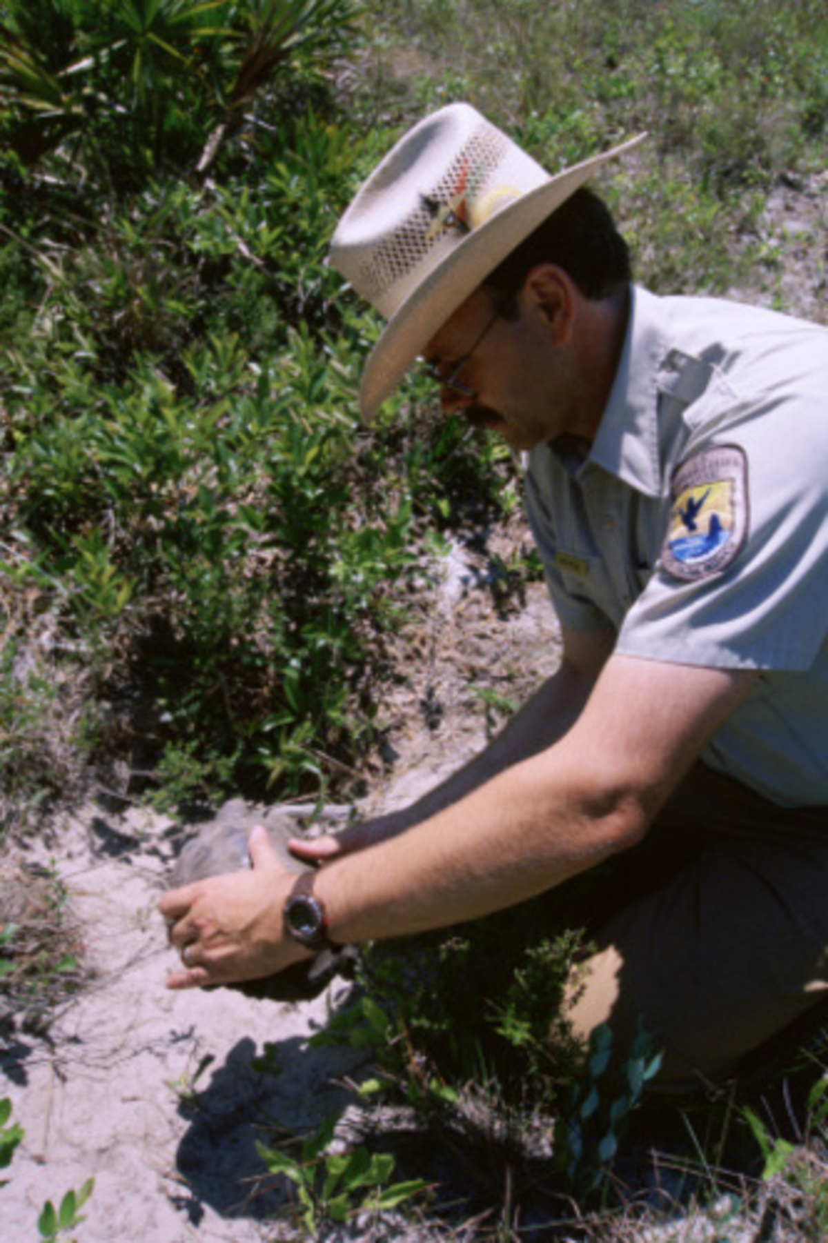 Fish and Wildlife Service employee picking up threatened species gopher tortoise from sandy soil beside burrow entrance.