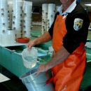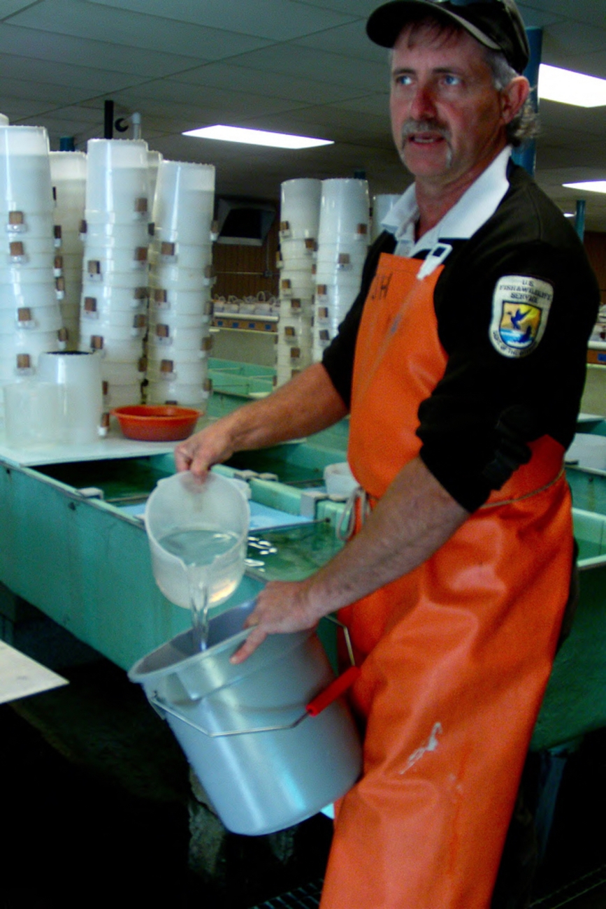 A FWS employee rinses eggs at the Carson National Fish Hatchery. Rinsing the eggs aids in fertilization. Image taken from USFWS Pacific Region Flickr page.