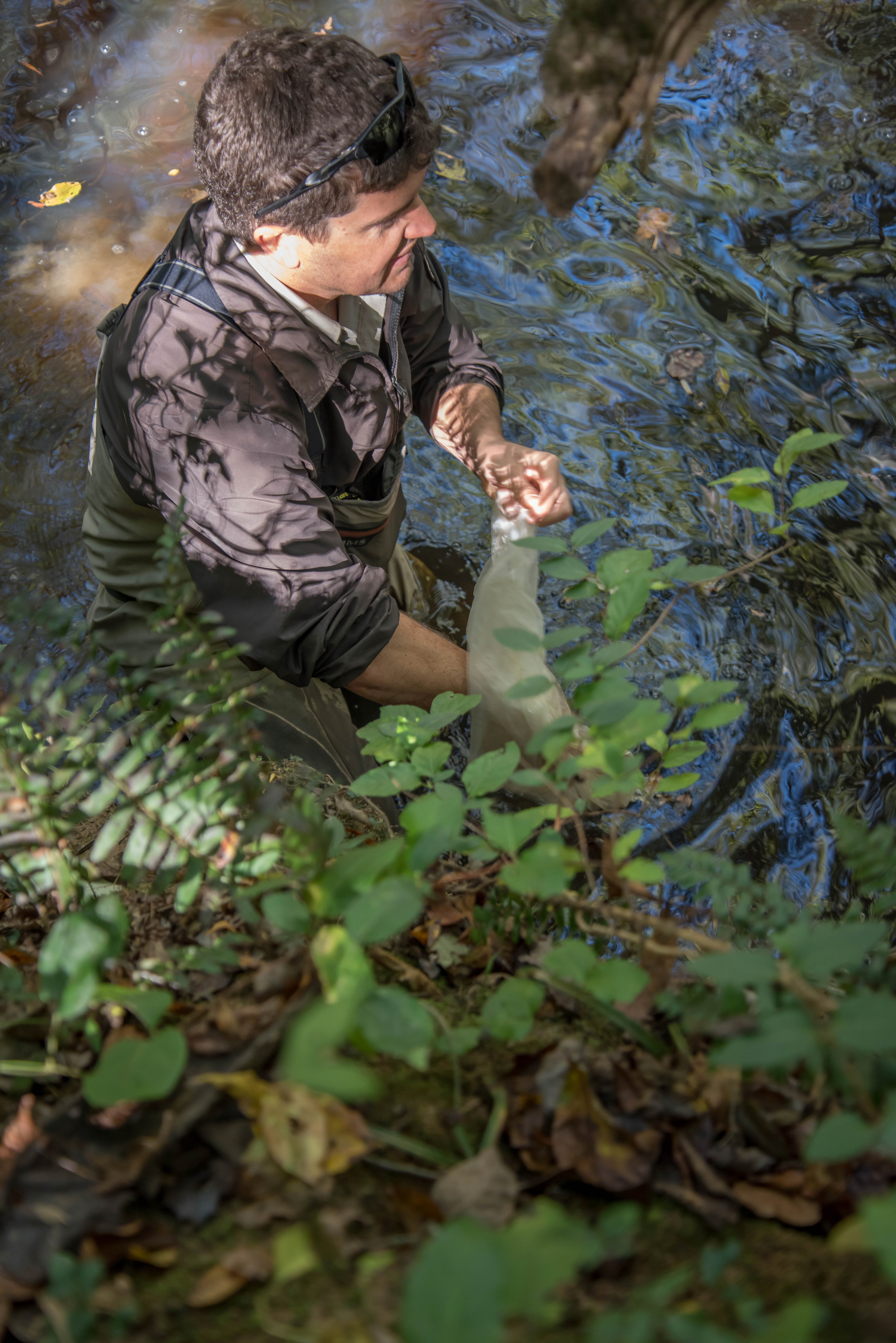 Fish and Wildlife Service mussel biologist, Jonathan Wardell, releases endangered Carolina Heelsplitter