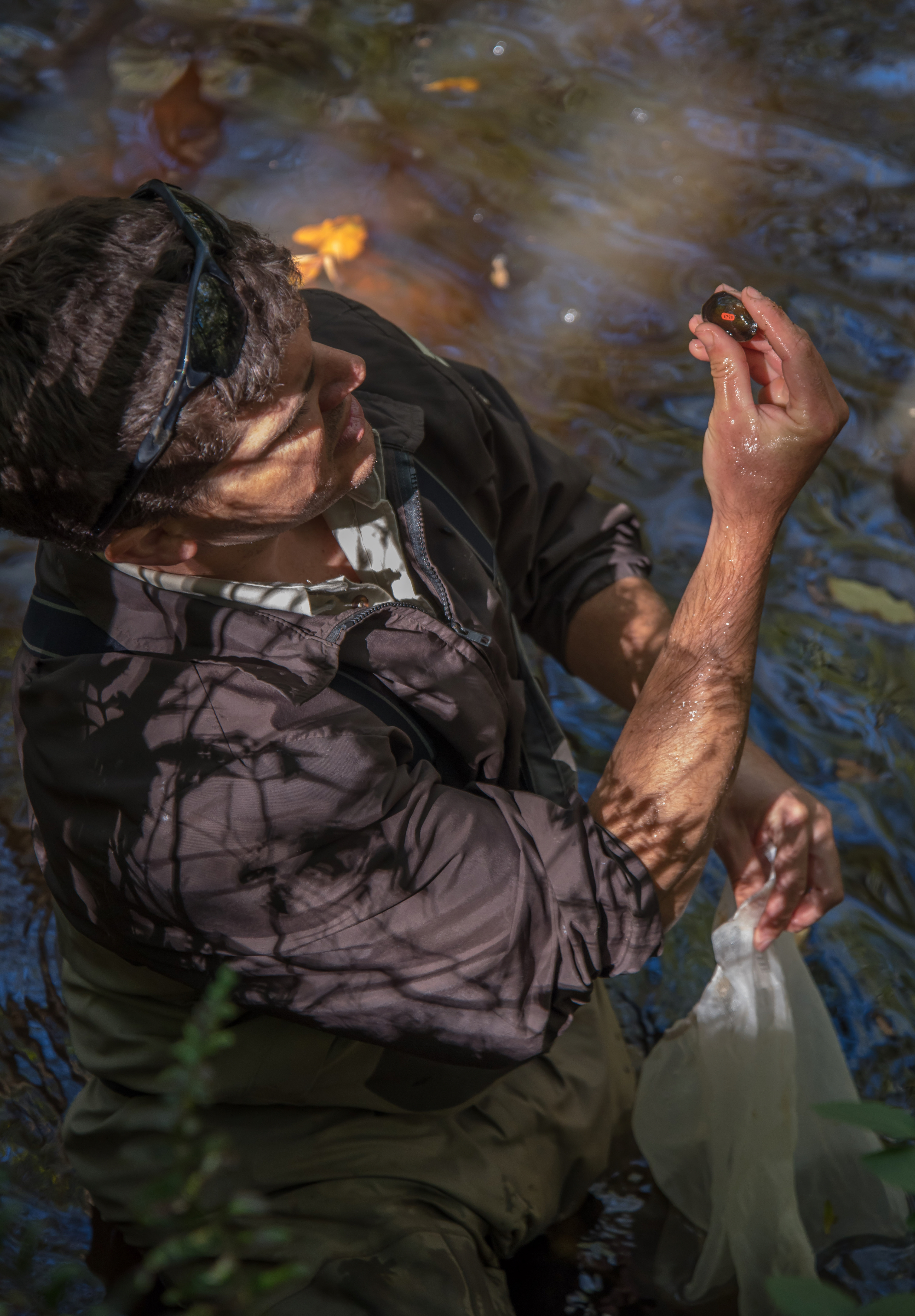 Fish and Wildlife Service mussel biologist, Jonathan Wardell, releases endangered Carolina Heelsplitter