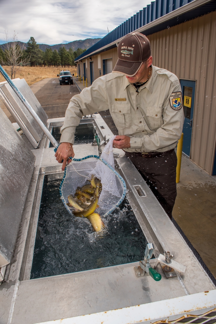 FWS personnel loading Gila Trout onto Fish transportation truck at Mora National Fish Hatchery