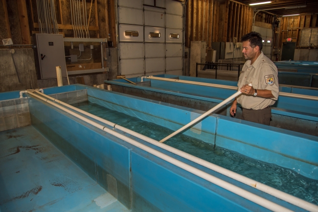 Fish and Wildlife Service staff employee cleans fish raceways